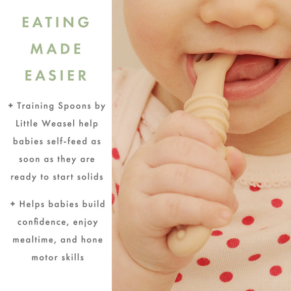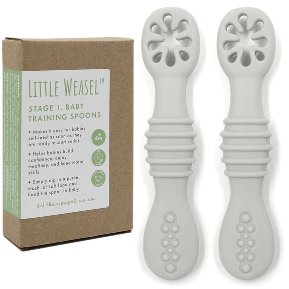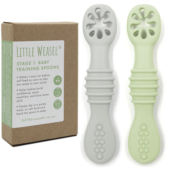 Stage 1 Baby Training Spoons by Little Weasel help baby along on the self-feeding journey. These spoons are made for tiny fingers and grip easily to purees and mashes, allowing babies to feed themselves, enjoy mealtime, hone fine motor skills -- and grow in confidence along the way. Ideal for Baby Led Weaning (BLW) or for any Baby Starting Solids.