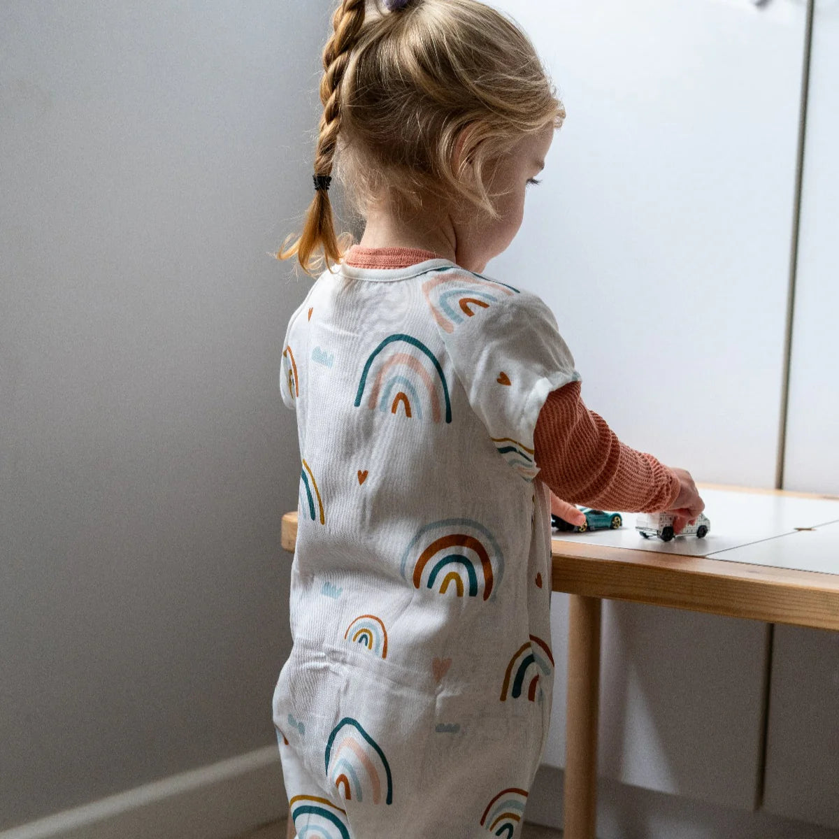 MACCIE muslin sleep suits have been designed to be over-sized to ensure ample room for movement to help little ones sleep safe and sound. Toddlers can easily walk around in them, convenient two-way zipper down the middle and press studs means bedtime nappy changes couldn't be easier!