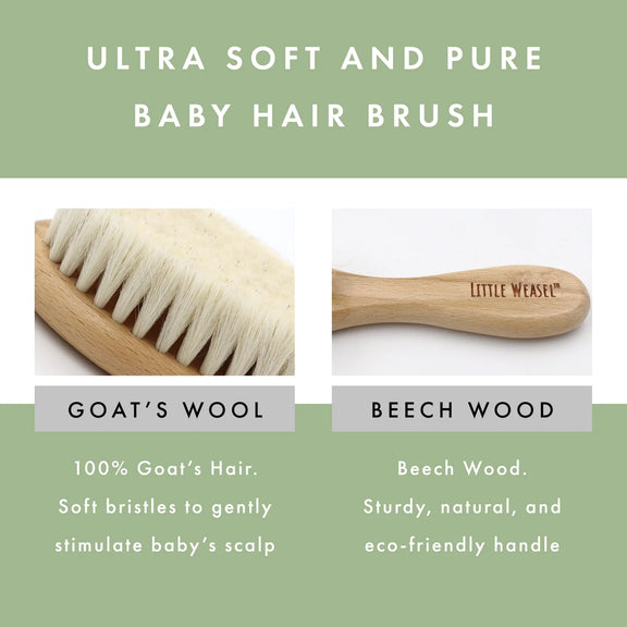 Our Beech Baby Hair Brush is an ultra soft brush for your little one. Made of 100% goat's wool bristles and sturdy, eco-friendly beech wood. A pure and natural option to brush baby's hair.