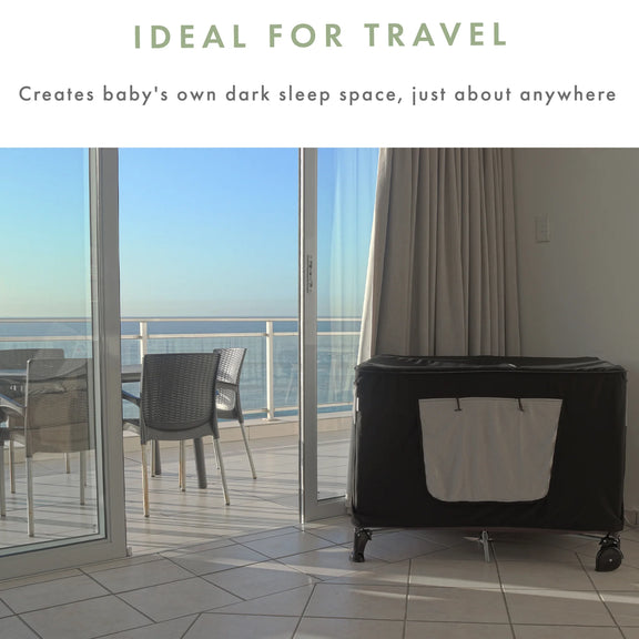 Our cover is an excellent travel aid. As parents know, many babies and toddlers struggle to sleep whilst traveling because they are in an unfamiliar location, or simply because the available curtains don't make the room dark enough. Our cover helps solve these problems by keeping the sleep space dark and consistent. For travel, we recommend using the cover for several days before your trip to acclimatise your child.