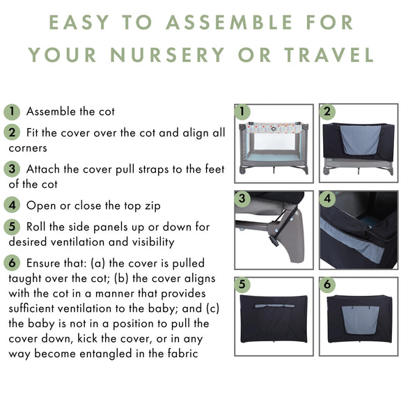 How do I use the cover? The cover fits snugly over a camp cot and can be secured in place with elastic loops. Ensure that: (1) the cover is pulled taught over the cot; (2) the cover aligns with the cot in a manner that provides sufficient ventilation to the baby; and (3) the baby is not in a position to pull the cover down, kick the cover, or in any way become entangled in the fabric.