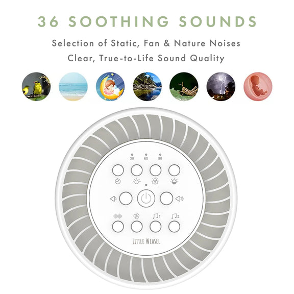 - 36 Soothing Sound Options. These include: 7 static white noise pitches; 7 fan sounds; 11 nature sounds including birds, stream, crickets, campfire, and multiple rain and ocean sounds; and 11 additional soothing sounds including various lullaby and music tunes, train sounds, hiss, heartbeat / womb, and ticking noises.