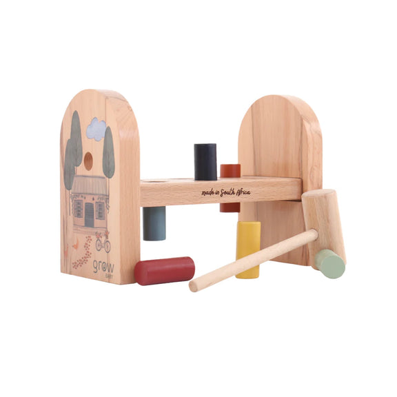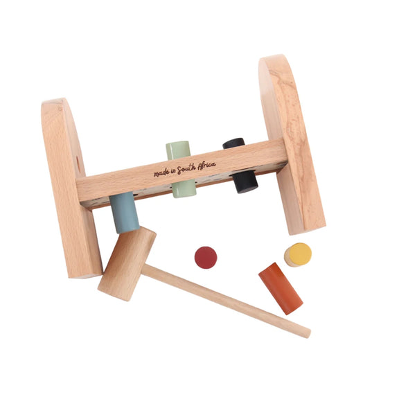 This sturdy wooden toy will stimulate eye-hand coordination development as your toddler hits the wooden pegs into the holes. With this beautiful shaped and inspired design, the pieces and hammer are easy to handle with small hands.