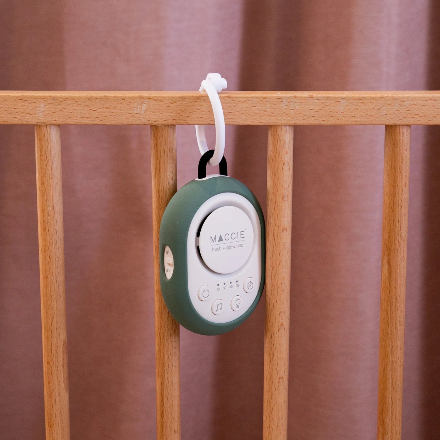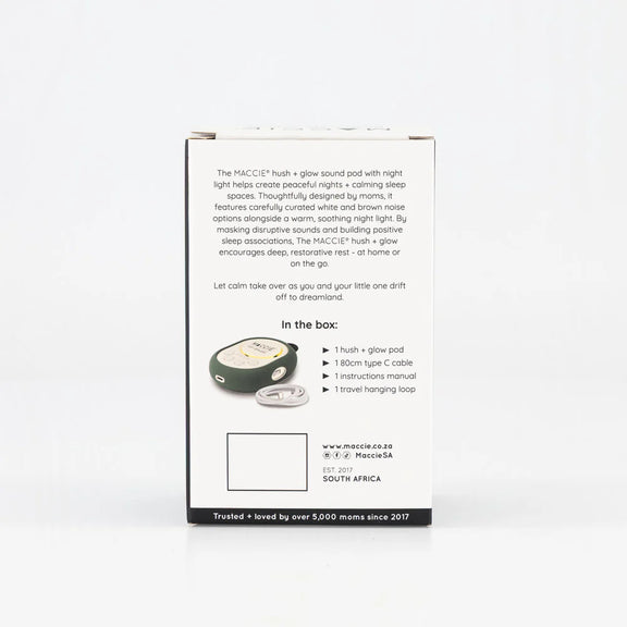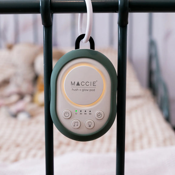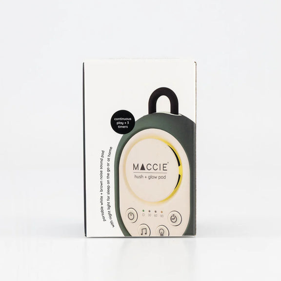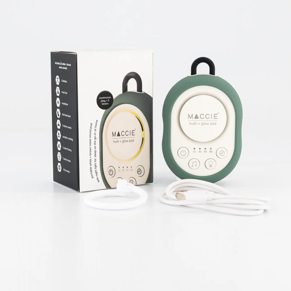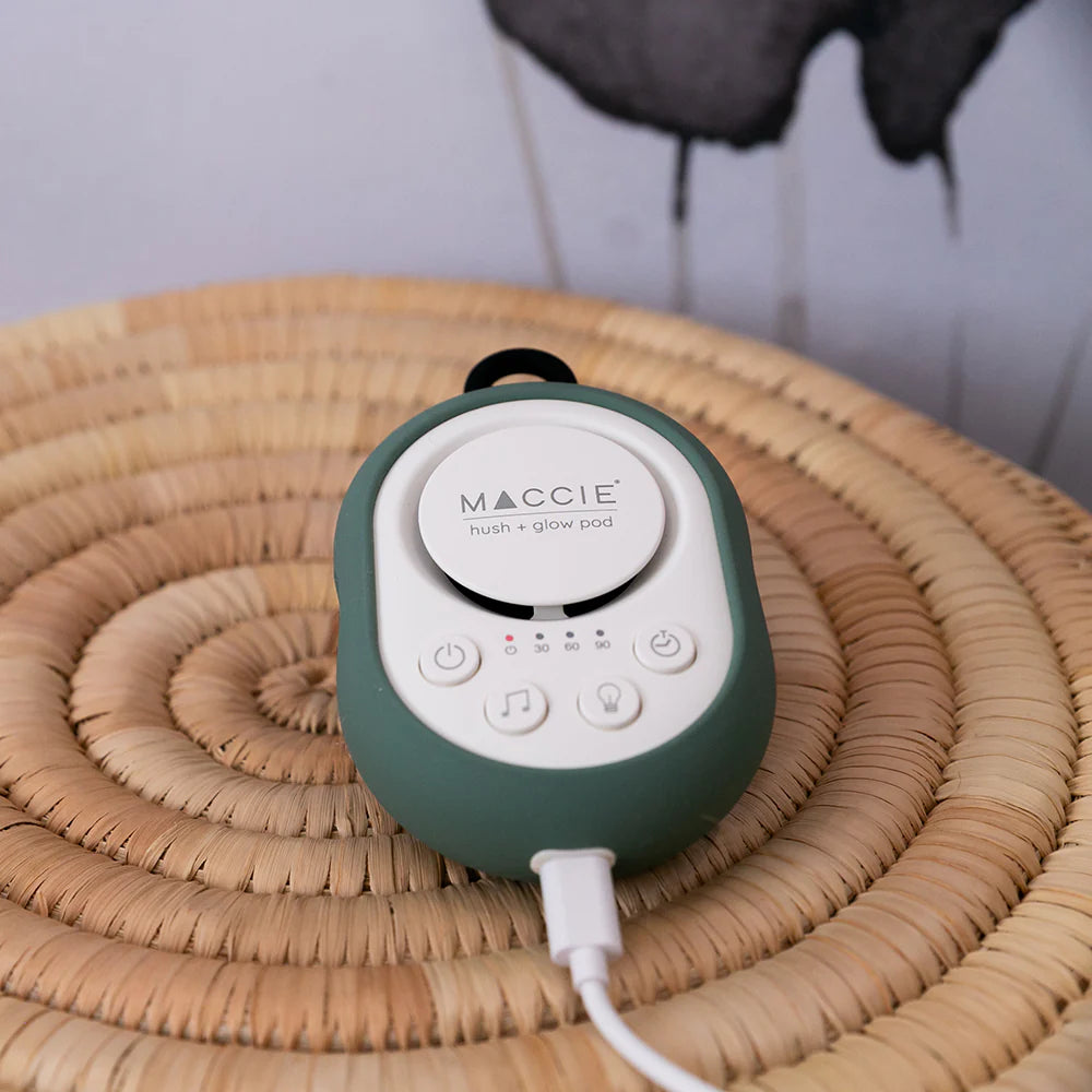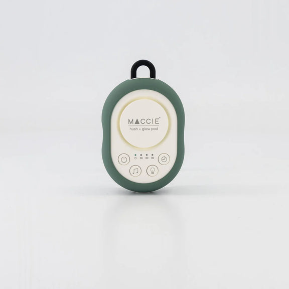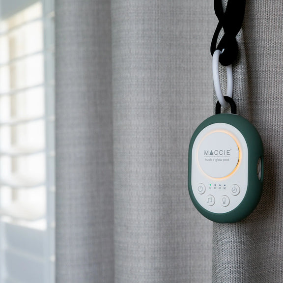 The MACCIE hush + glow pod is a portable white & brown noise sound machine with a dimmable night light designed to help create a peaceful sleeping environment for babies at home or while travelling.