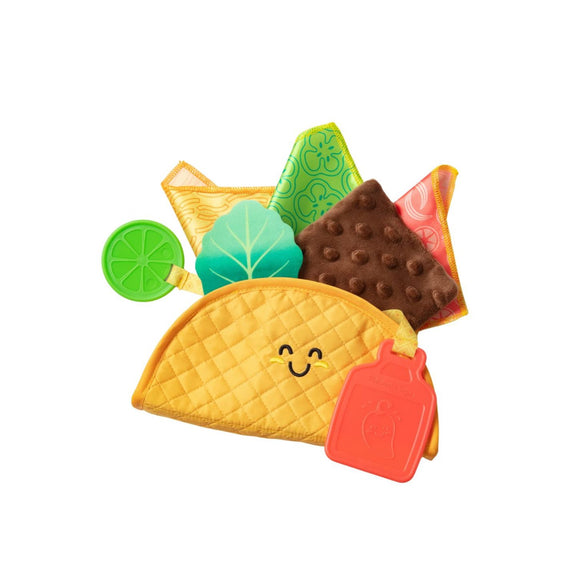 - The 12-piece infant toy includes a soft foam taco shell, 3 smooth fabric pieces, 3 textured crinkle pieces, 3 food-shaped fabric pieces, 2 attached textured pieces