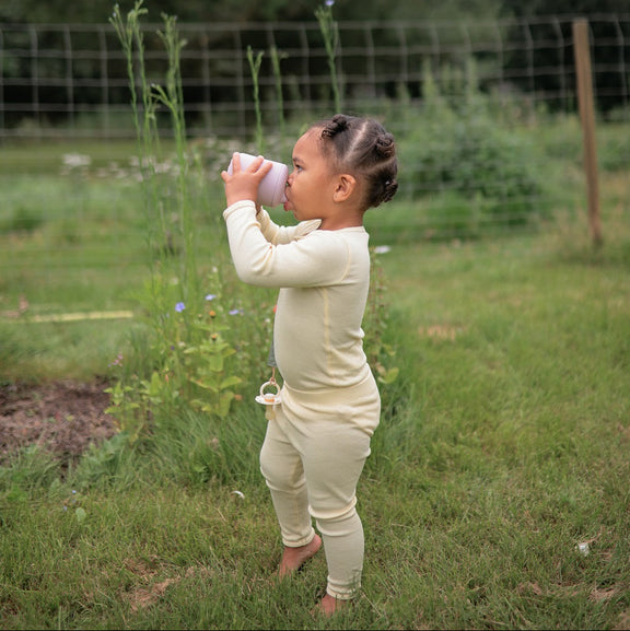 A simple and beautiful sippy cup, perfect for little hands to hold. As baby begins the transition from baby bottle to cup, a sippy cup will help develop fine motor skills and independent eating habits.