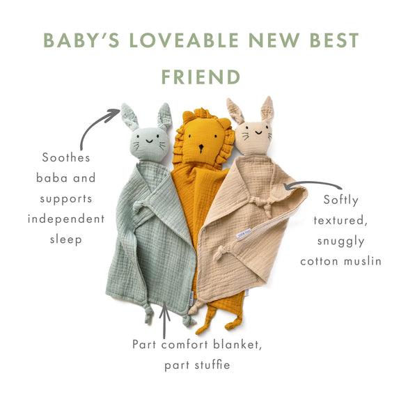 - Ultra soft Muslin: Our 100% cotton muslin material is ultra soft, light and airy. Babies will enjoy the gentle texture of the muslin. Baba may also enjoy gripping onto the knots and rabbit ears