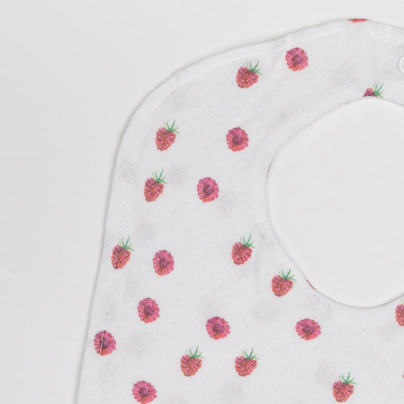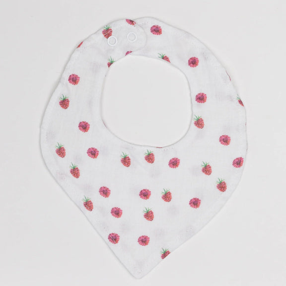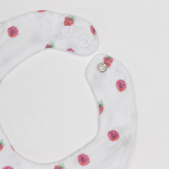 Cotton raspberry print muslin bib for the dribbles and to pair any outfit perfectly.