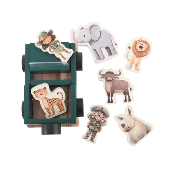 - Wooden figures: Each Big 5 animal is crafted from high-quality wood, with intricate details and textures. An Additional two characters are spotted driving the vehicle and the other spotting things in the distance.