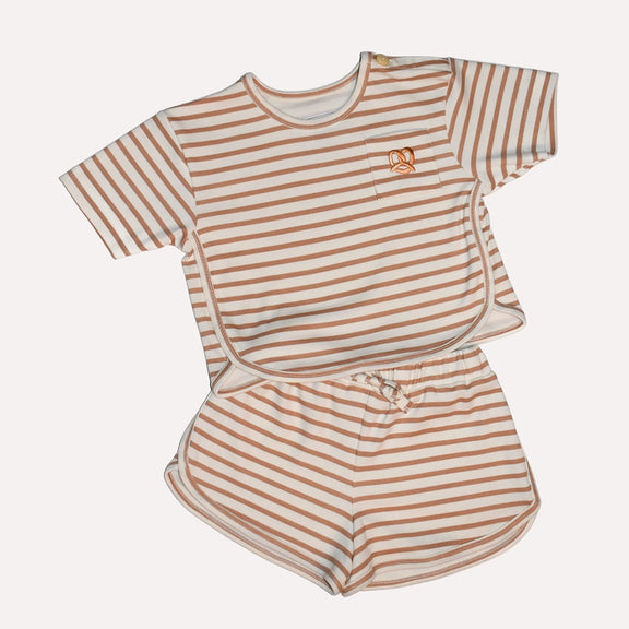 Oversized stripped shorts with rounded hem and slit detailing on the side and a mock drawstring.