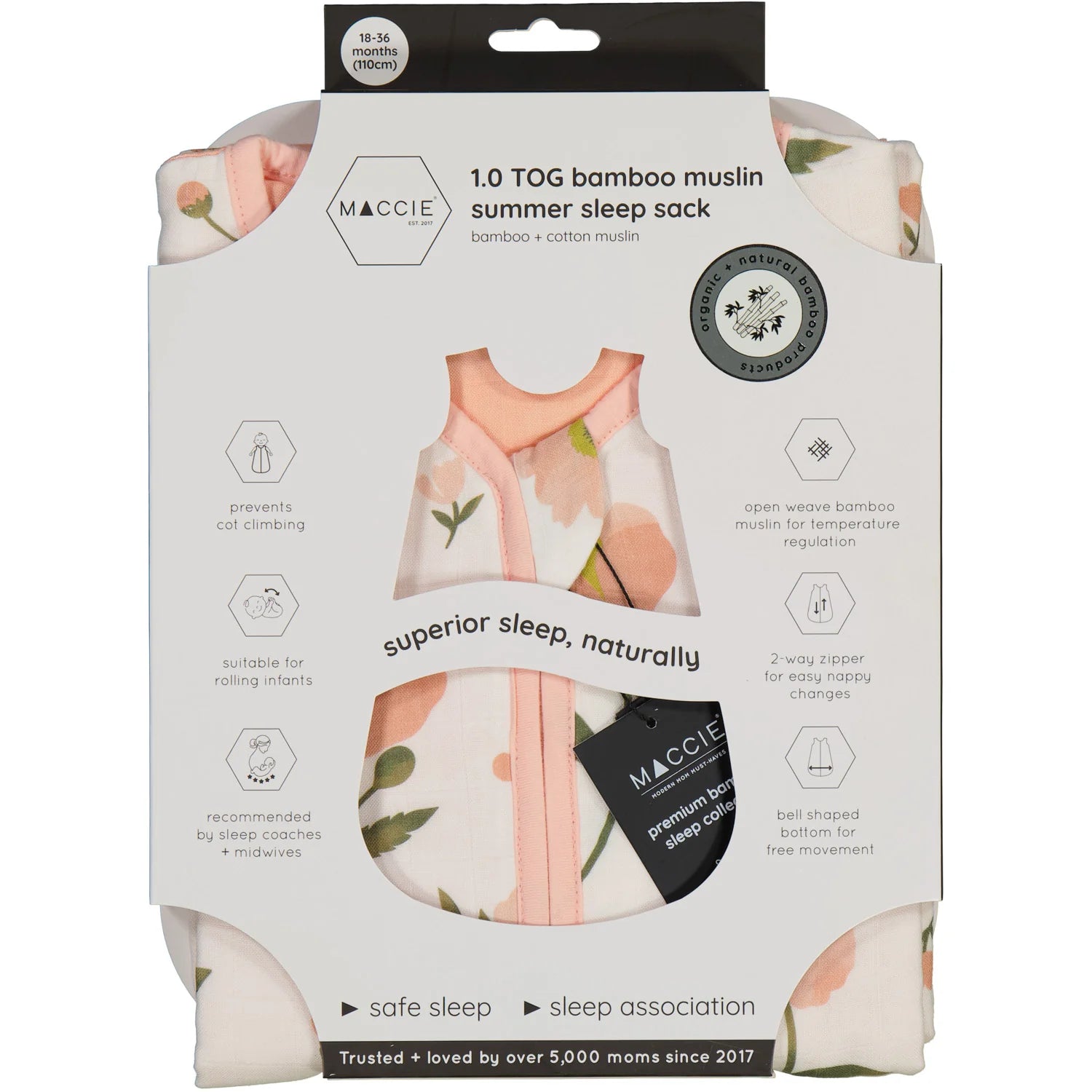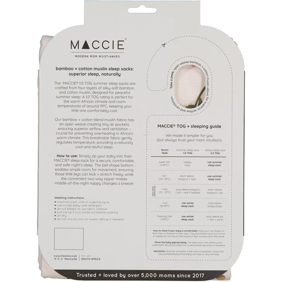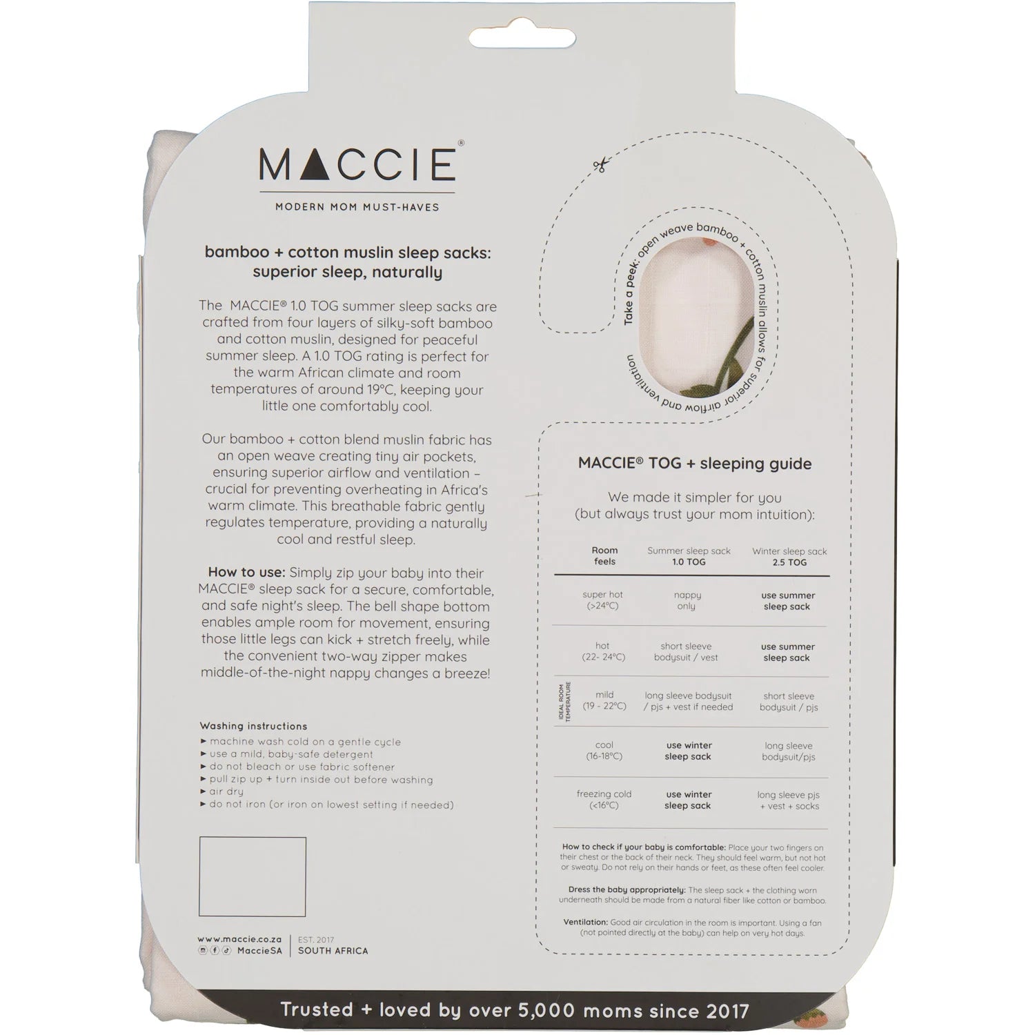 MACCIE muslin sleep sacks have been designed with ample movement room to help little ones sleep safe and sound. A convenient two-way zipper down the middle makes bedtime nappy changes even easier!