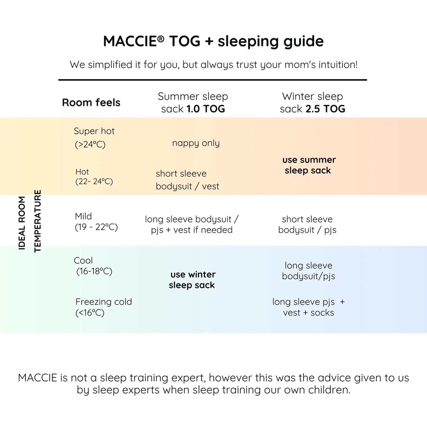 Made from two layers of silky-soft 70% bamboo and 30% cotton muslin, MACCIE sleep sacks are lightweight, breathable, and impossible to kick off. The recommended room temperature is 22 - 28 degrees.