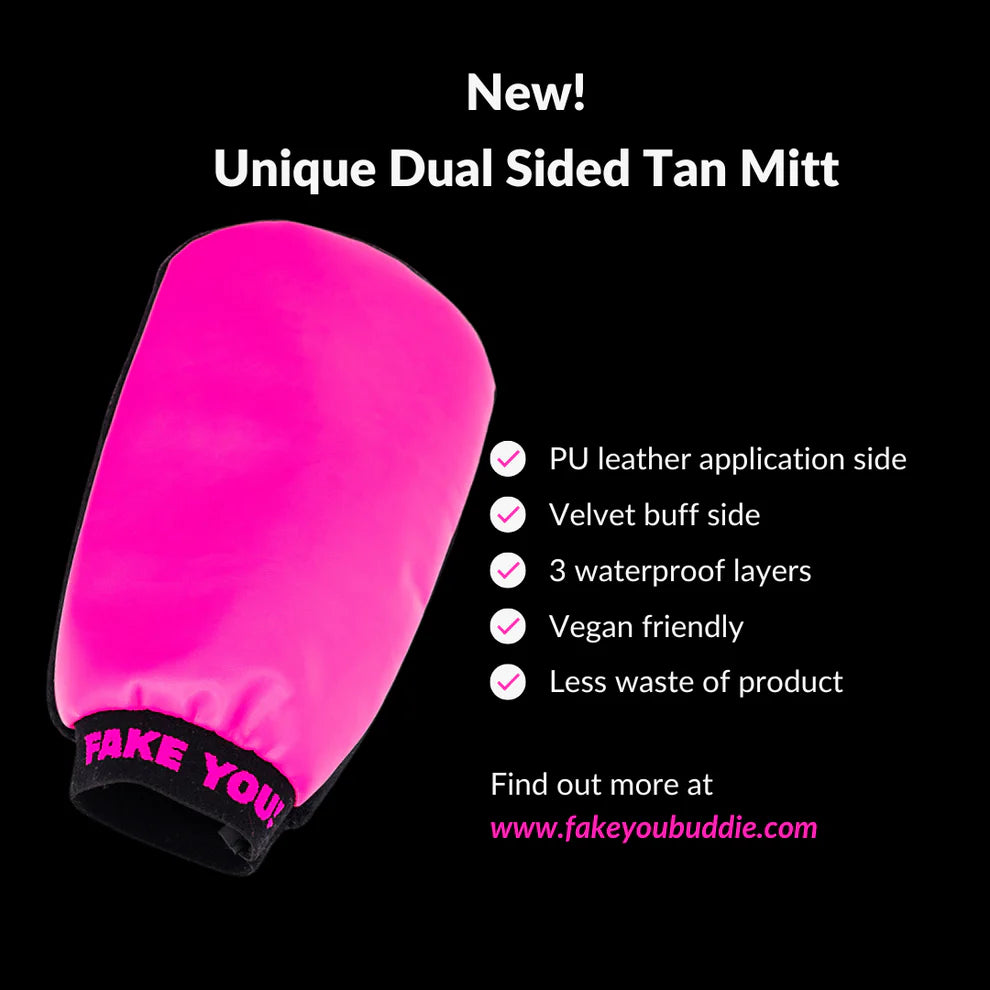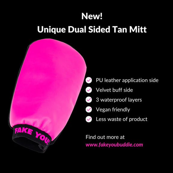 Introducing Fake You! The ultimate self-tanning mitt that takes your glow to the next level. Its dual-sided design combines PU material for efficient product application and velvet for a smooth, flawless finish. With three layers of 100% waterproof protection, you can look forward to no more stained hands. It also has an internal elastic strap for added stability. The Fake You! tanning mitt ensures a mess free, professional tan like no other, with no waste of product.
